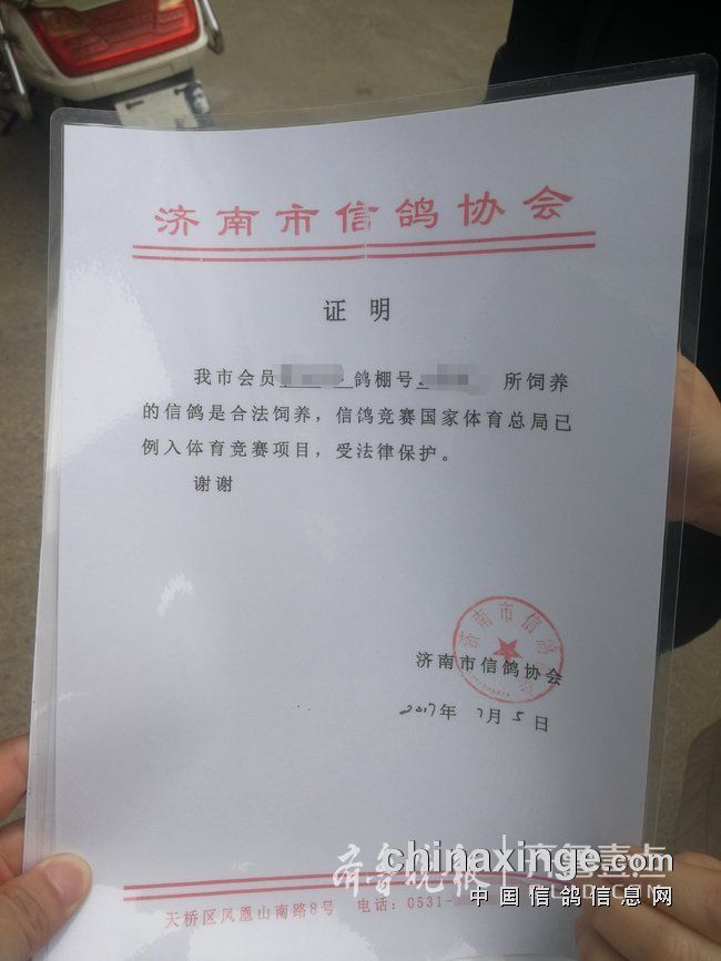 随后,记者在楼下另一名城管执法人员手中见到了苏先生提供的材料。材料中有苏先生中国信鸽协会的会员证,还有另一份“济南市信鸽协会”的红头文件。“我市会员苏**鸽棚号28**,所饲养的信鸽是合法饲养,信鸽竞赛国家体育总局已列入体育竞赛项目,受法律保护。”下面还有盖着济南市信鸽协会的公章。