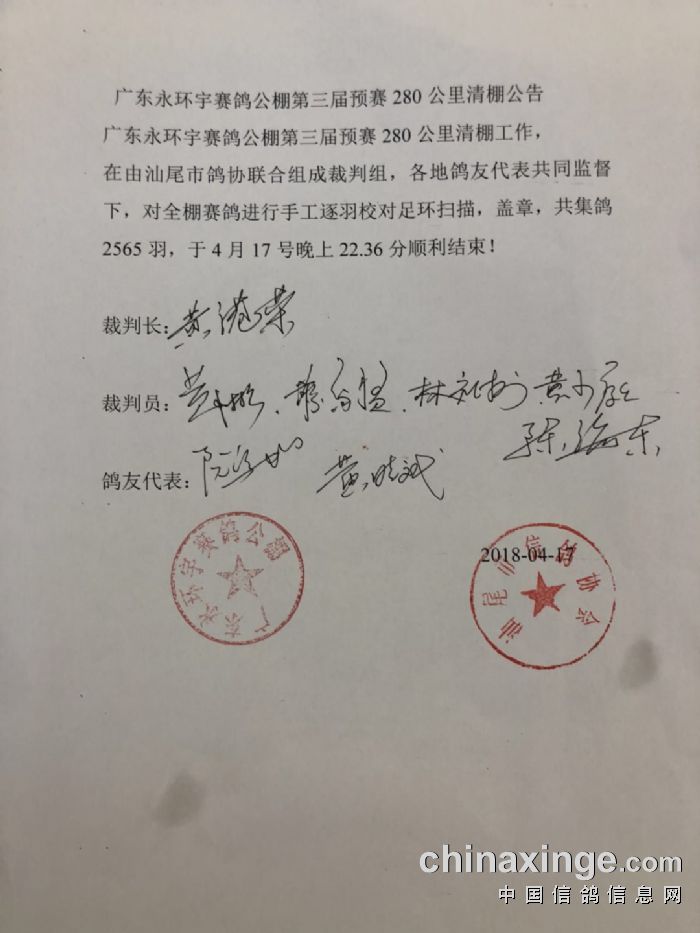 4月17日,广东永环宇赛鸽公棚280公里预赛由汕尾市信鸽协会裁判组,联合各地鸽友代表,共同对全棚赛鸽手工逐羽扫描,盖章,共计上笼2565羽参赛鸽。