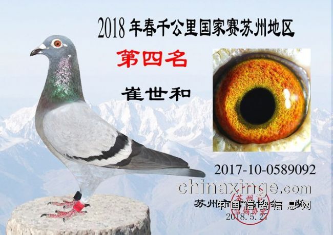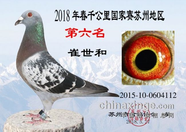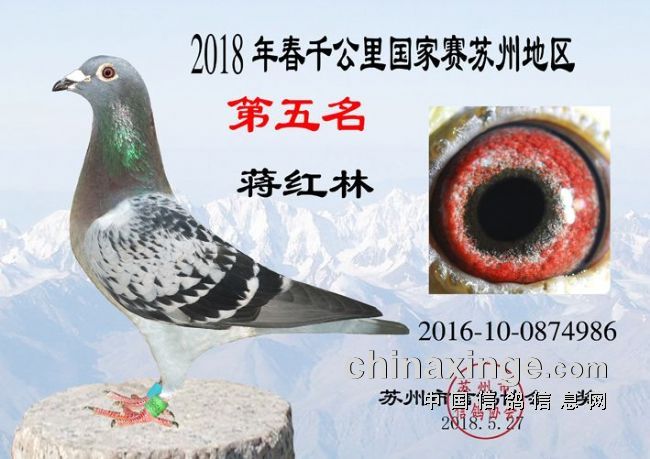 2018年江苏省“百世恒”千公里联赛暨国家赛共集鸽20559羽,苏州市1195羽勇士于5月20日7:28渭南市华阴司放点放飞,5月22日19:44:15,江苏徐州的鸽友刘军的2015-10-0677237赛鸽率先归巢,成为本届千公里首羽归巢鸽。苏州地区赛距普遍较大,空距近1100公里,5月23日13:16:56.13,蒋红林的2016-10-0875441赛鸽顽强归来,成为本届千公里国家赛苏州地区的冠军鸽。顾清的2013-10-0581139及刘耀清的2017-10-0585383赛鸽则分别获得亚军、季军。