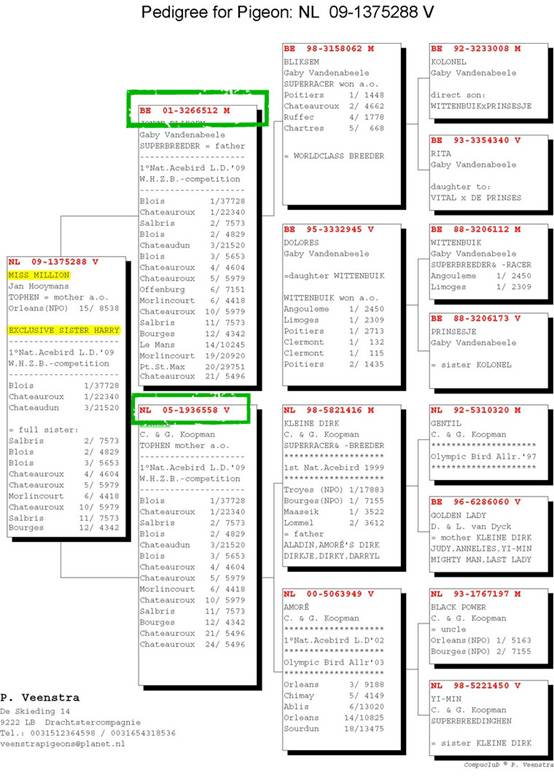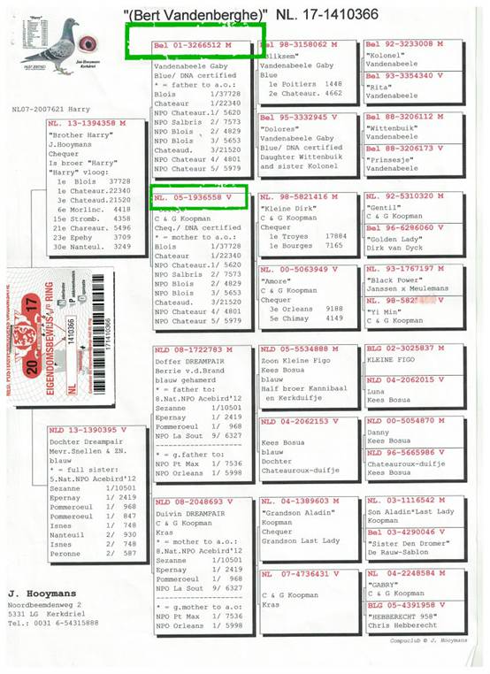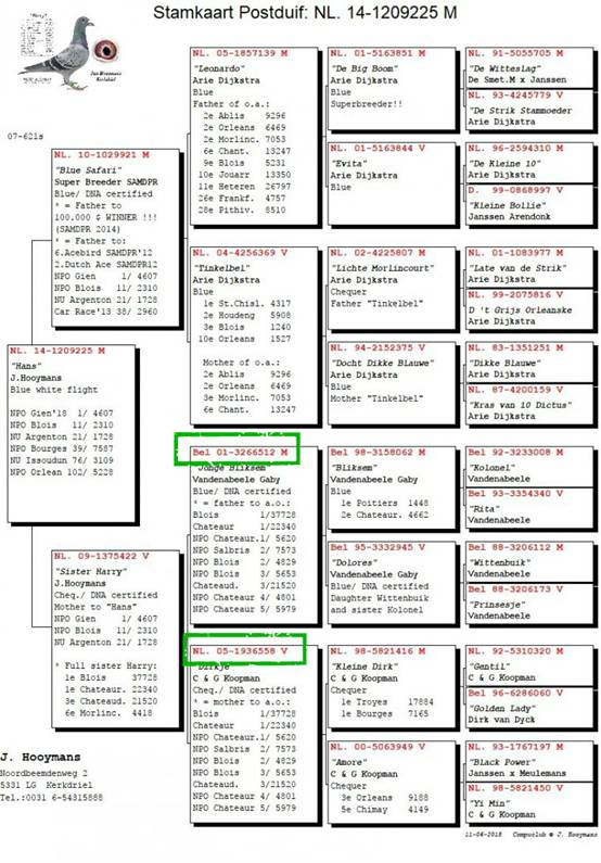 冠军鸽NL17-1410562的母亲是布洛瓦37728羽冠军、铭鸽“哈利”的半妹,外祖父是“年轻闪电”。