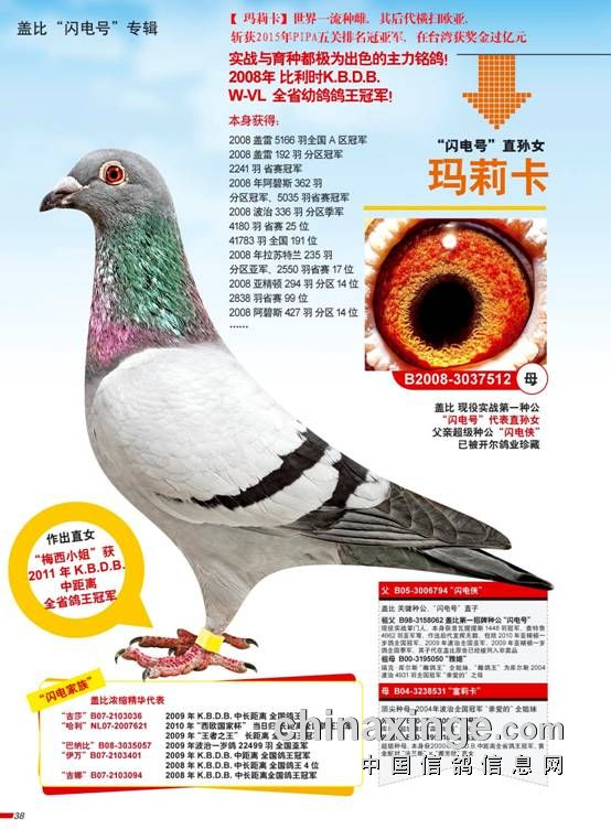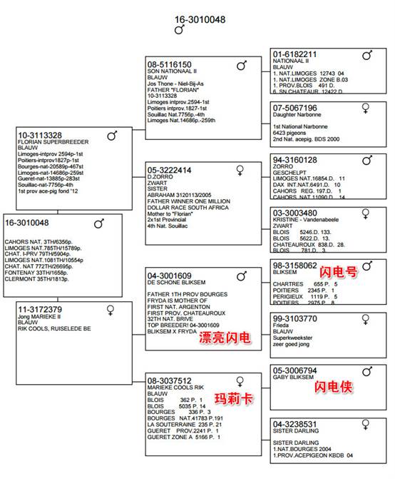 “玛莉卡:08中距离幼鸽省鸽王冠军”是盖比“闪电号”孙女,“闪电侠”的女儿
