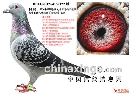 在欧洲赛场,7月7日上午9点百年经典——欧洲巴塞罗那千公里国际赛于西班牙巴塞罗那开笼放飞,比利时、荷兰、法国、德国、英国、卢森堡六国15707羽远程精英参加比赛。经过一天的漫长等候,冠军鸽于次日上午10点14分48秒凯旋,环号为B15-4014328,此鸽的外祖母是盖比“闪电号”直女,我们看一下获奖鸽的血统书。