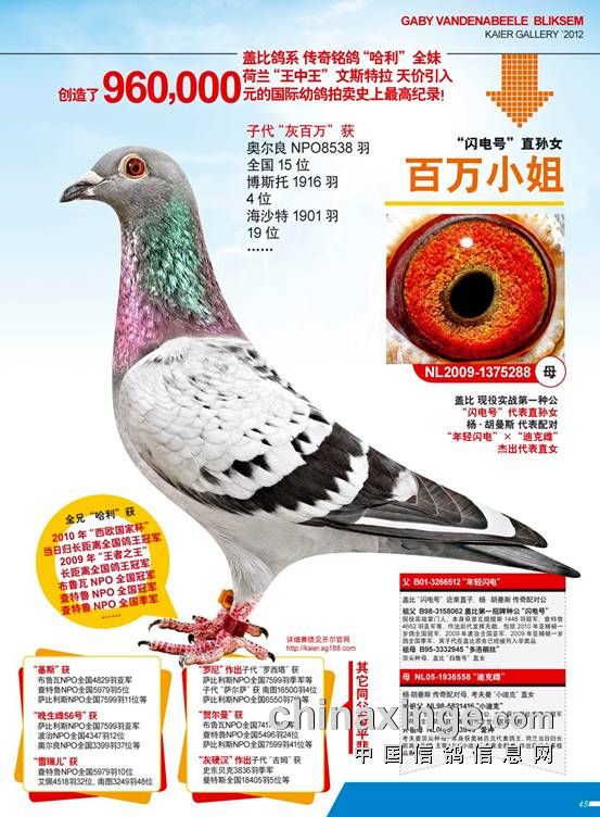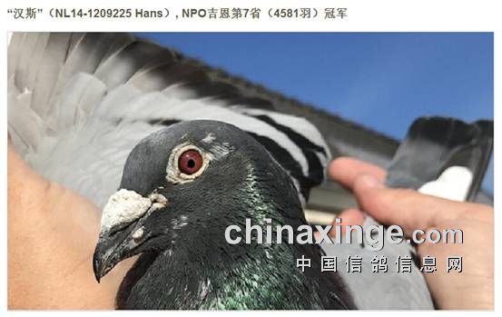 “汉斯”的母亲与世界大铭鸽“哈利”还有创亚洲幼鸽最高拍卖纪录的“百万小姐”是一奶同胞,它们同时是“闪电号”直子“年轻闪电”X“迪克雌”作育的超级种赛鸽。
