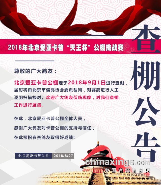 目前,各地公棚进入强制家飞阶段,西南地区的部分公棚已完成短距离资格赛,开始清棚收费,组织鸽友探视等工作,吹响2018年秋赛号角。近日,北京市爱亚卡普公棚、北京惠翔国际公棚两家高端大棚相继发布公告,计划定于9月1日进行查棚工作,全程由北京市信鸽协会裁判组人工扫描核对验鸽。