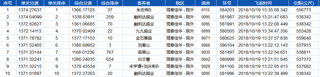 本场比赛前十名归巢成绩如下:>>北京琨泰佳华第二关550公里归巢直播