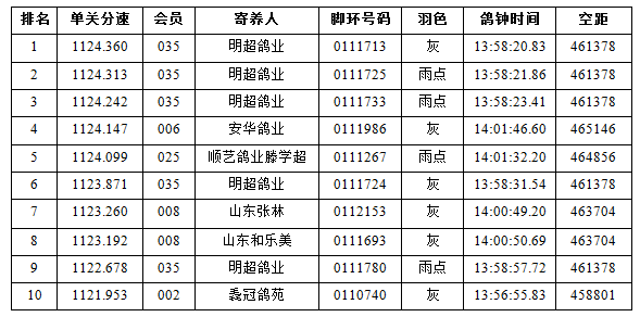 山东舜峰赛鸽特比环第一关450公里比赛前三名被明超鸽业一家获得,该会员还获得了六名、九名的好成绩。山东安华鸽业获得四名,金翅膀团队顺艺鸽业滕学超获得五名,北京万博恒天团队山东张林与山东和乐美分别获得七名、八名,王牌战队毳冠鸽业获得第十名。