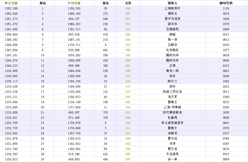 14:21:24,上海陆伟平一羽环号为1126的灰鸽率先落棚,以1252.389米/分的速度顺利将本关冠军收入囊中。周祥云的一羽赛鸽紧随其后,分速1252.049,以微弱的差距位居第二。一羽接一羽的鸽子纷纷落棚,现场一下子热闹起来。完成本关挑战的赛将,预计下周将开展最后一关的角逐。