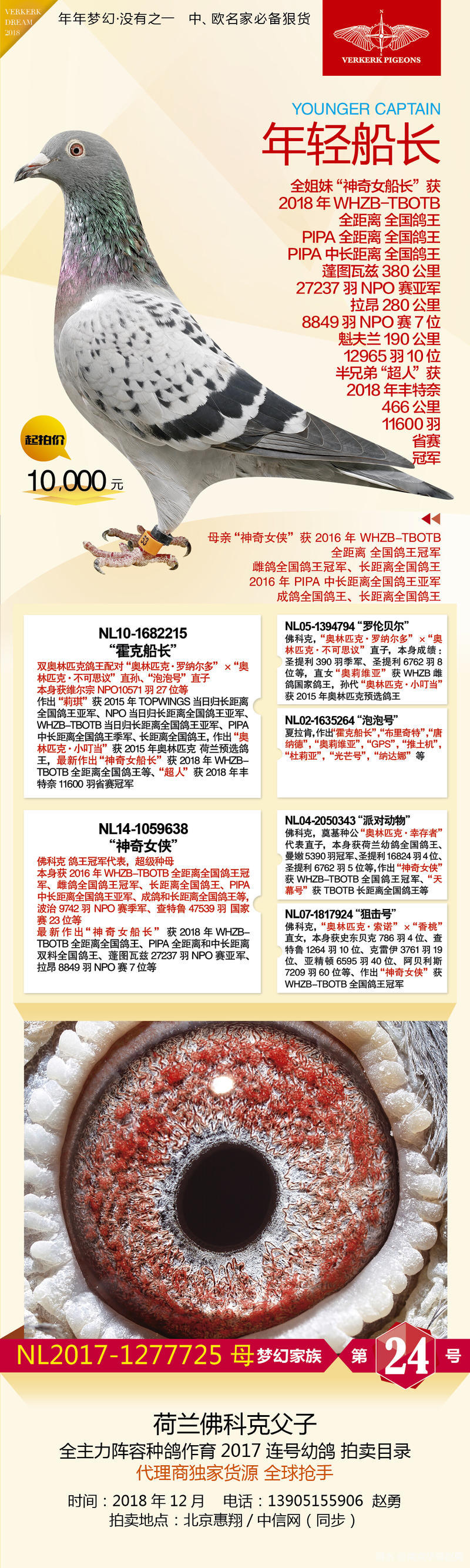 全能王牌“霍克船长”NL10-1682215是佛科克奥林匹克双鸽王配对的后代,继作出“奥林匹克·小叮当”、“莉琪”和“特一号”后,延续子代多次获得鸽王的神奇表现,2018年与全国鸽王冠军种母“神奇女侠”强强联手,作出“神奇女船长”获2018年WHZB-TBOTB全距离鸽王、蓬图瓦兹27237羽NPO赛亚军等成绩。