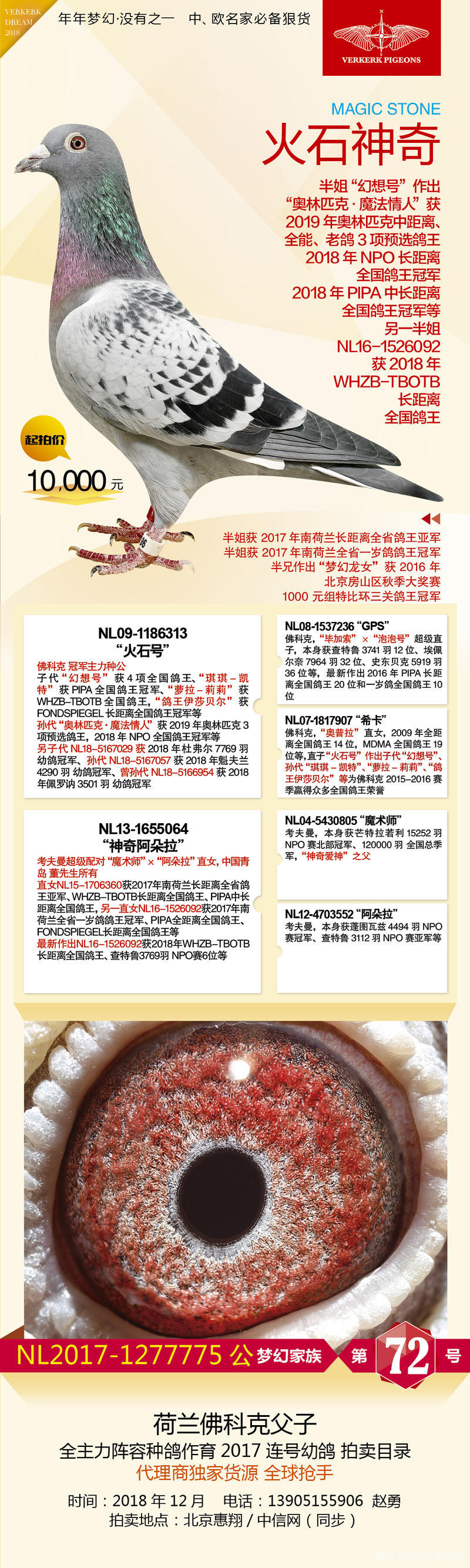 “火石号”NL09-1186313,名符其实的鸽王发动机,2018年孙代包括奥林匹克、PIPA等多羽超级鸽王,子、孙代在欧洲和中国2016年同时发力,直女2015-2016年获得超过4项国家鸽王的“幻想号”、代表孙代“鸽王伊莎贝尔”获2016-2017年FONDSPIEGEL长距离全国鸽王冠军等。此外在中国,直孙女“梦幻龙女”CHN16-01-0296215在2016年北京房山秋季1000元特比环热身赛300公里17位、第一关500公里6位、第二关550公里5位、第三关550公里76位,最终赢得三关鸽王总冠军。