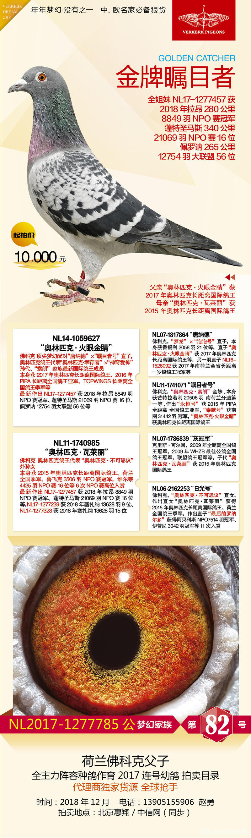 本次佛科克85羽整轮连号专场拍卖会的参拍鸽,都是和佛科克2018年参赛鸽同步作出,因此才会出现包括奥林匹克鸽王、荷兰全国鸽王冠军以及NPO赛冠军的平辈,这都是佛科克平日决不会出让的顶尖血统。以下是部分代表拍品: