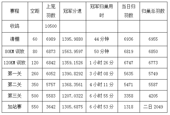 而精彩远不止于此,12月13日,经过三关考验的3642羽赛鸽再次披挂上阵,踏上550公里加站赛征程,最终在经历6小时53分的艰难飞行后,冠军归来,分速1305.6875米/分,两日归巢赛鸽超2000羽!至此,宁夏玺恒翔公棚第六届秋赛圆满落幕!
