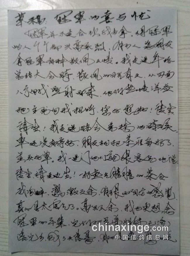 回想当初在没有晋级的日子里,自己觉得像屋角里的一只死老鼠,无人理睬你。秋赛以后,我家里的客人一批又一批,真的是说不清的鸽子讲不尽的情。