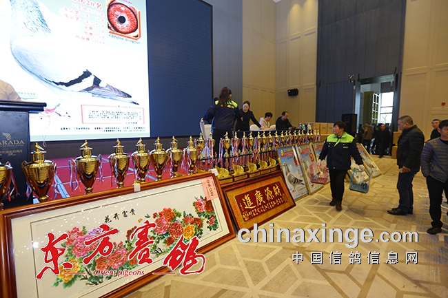 获奖奖杯和鸽友赠与爱翔的牌匾摆满主席台