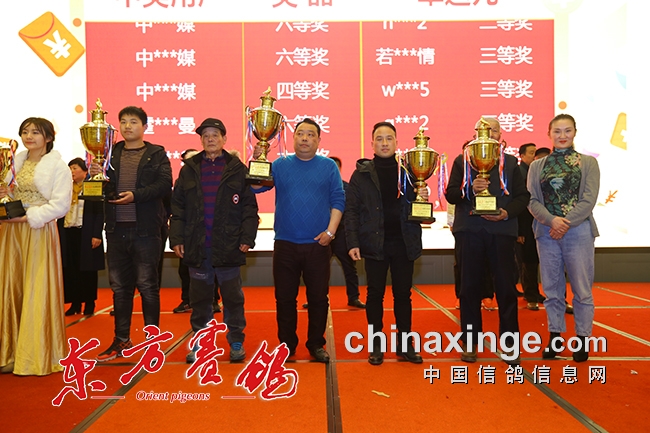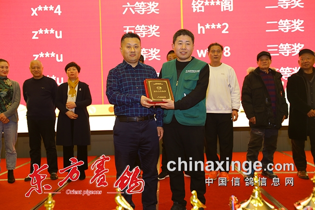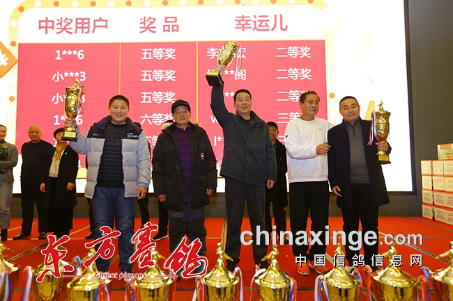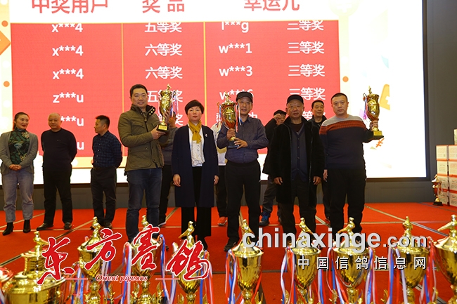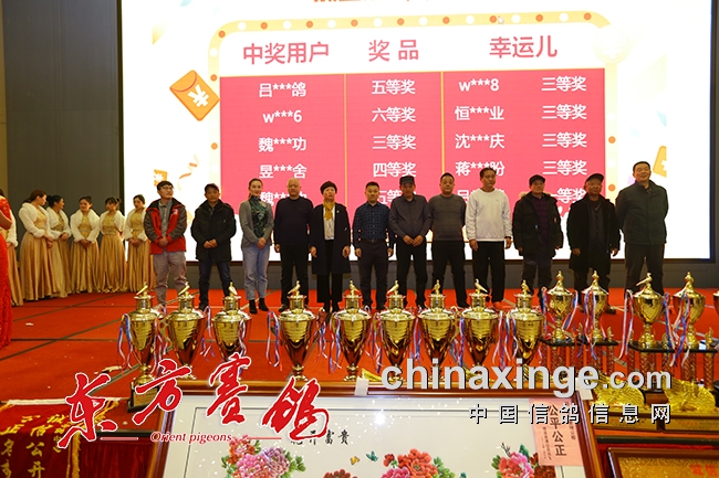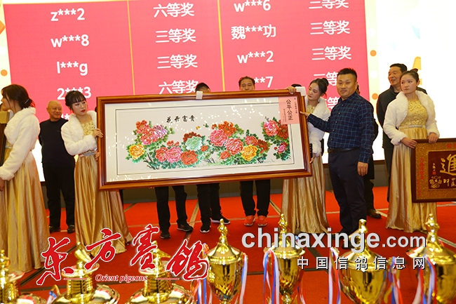 随后特邀颁奖嘉宾徐州信鸽协会会长张继祥、河南省信鸽协会副主席曹海泉;安徽省滁州市信鸽协会会长刘汉松;淮安市信鸽协会会长郭吉明;西安爱丽丝鸽药总经理王新萍女士等人向本赛季荣获180公里热身赛、300公里预赛、500公里决赛、小团体、大团体、500公里决赛三关鸽王、加站赛双关鸽王、精英赛A组获奖、精英赛B组获奖名家颁发了奖杯。