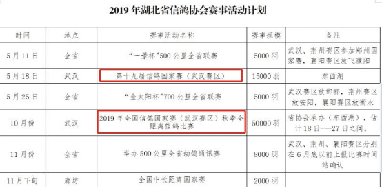 2019年,湖北省信鸽协会除了承办春季武汉国家赛之外,还将于秋季10月份举办首届秋季全距离信鸽比赛。目前,这项比赛的申请获得了批复,司放地点定在武汉东西湖,计划时间为10月18-27日。