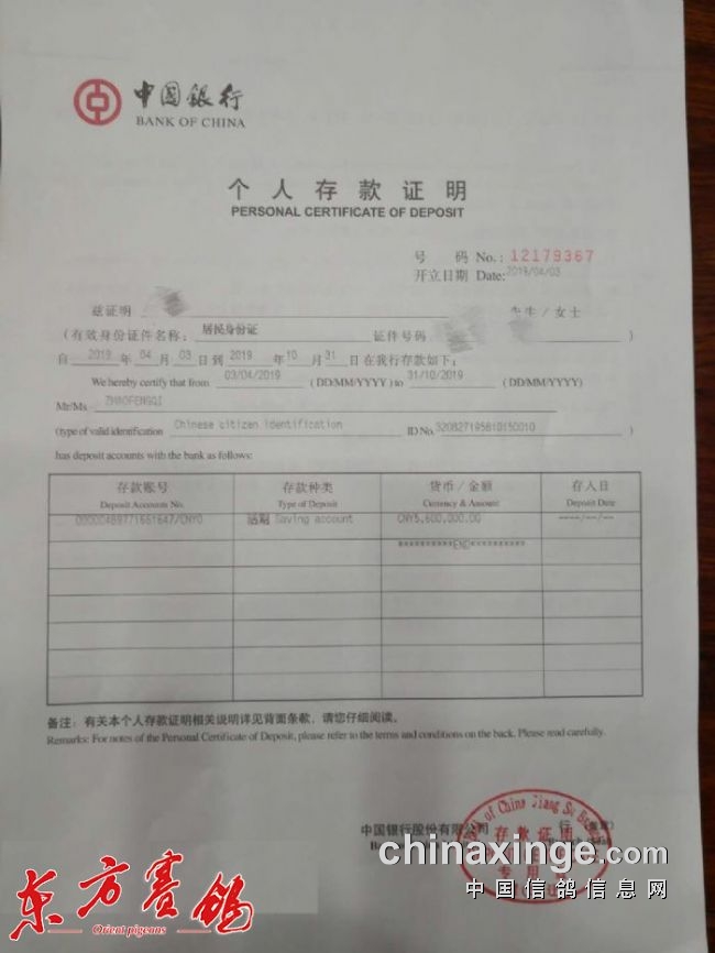 江苏金马国际赛鸽俱乐部已成功举办了二届比赛,今年是第三届秋赛,为了取信于来自全国各地参赛鸽友,俱乐部董事长赵凤琦在确定各个参赛团队入驻俱乐部以后,大胆地从自己私人存款中于4月3日转出今年秋季比赛应发奖金5600000元存入中国银行泗洪县支行,并明确了取出时间为10月31日,届时比赛结束,解冻颁奖。
