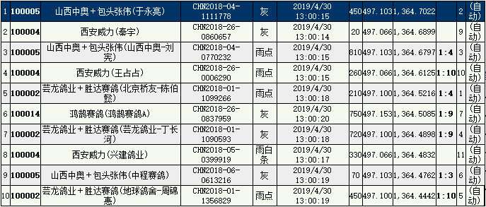今天早上(4月30日),陕西真如鹏飞信鸽俱乐部2019年春“汉王杯”第四关决战于6时56分在甘肃花庄镇开笼放飞,司放地经度:103°7′17.29″,纬度:36°12′27.91″,司放地天气晴转阴,有小于3级的西风,共计参赛鸽361羽。