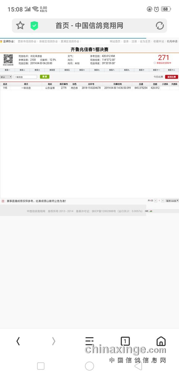 单枪匹马闯决赛,不辱使命终归来!195名,超出预料名次,令人欣慰的空中战士!有缘接你回家!两张探视图,后面是父母鸽,感谢大家关注!