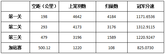 首关198公里比赛,上笼4642羽,归巢4184羽,归巢率90%;第二关293公里比赛,上笼4173羽,归巢3176羽,归巢率76%,冠军分速达1312.9115米/分;经过前两关筛选出来的精英在第三关决赛中纷纷爆发出真正的实力,5月11日,3196羽参赛鸽自陕西省勉县天荡山开始展开最后的角逐,经过六个多小时的艰苦奋战,最终成都鸽友壹壶轩魏锦毅的2018-22-0280194参赛鸽以1220.9247米/分的分速艳压全场,成为决赛冠军;亚军是成都洞子口邱锦的一羽灰鸽,环号为2018-22-2464969,分速1215.5869米/秒;季军是温江和盛联队(团一)一羽雨点鸽,环号为2018-22-0452000以1213.8268米/秒的分速获得第三。而本次决赛7名不仅一关比一关快,还是多项指定冠军、汽车赛以及特比环冠军,表现十分抢眼!为了让鸽友的赛鸽有再一次展现高水平、高质量的竞技机会,增加500公里加站赛,1220羽赛鸽再度出征,最终108羽勇士凯旋,鸽友32159鸽舍-滕松柏一羽环号为汽18-22-1879793的灰鸽夺得冠军。