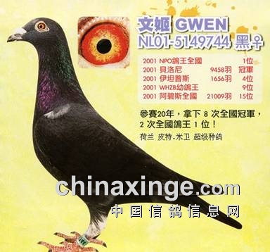 2001年,皮特·米卫鸽舍的一羽美丽的全黑雌鸽“文姬”耀眼夺目,这羽黑雌鸽以贝洛尼9548羽冠军、伊坦普斯1656羽4位、阿碧斯全国21009羽15位等的成绩拿下2001年荷兰全国幼鸽鸽王冠军。