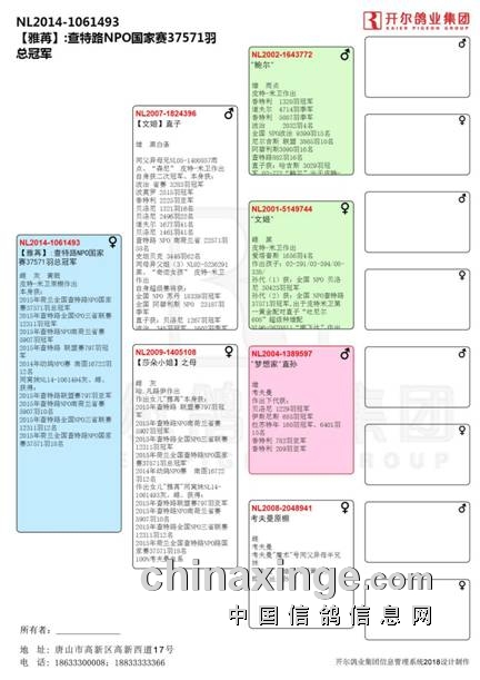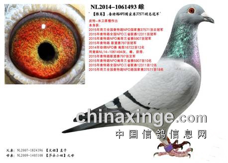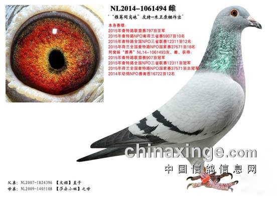2015年收获荷兰查特鲁NPO国家赛总冠军“雅苒”就是“文姬”的孙女,父亲为“文姬”直子,本身荣获:波治省赛3283羽冠军、波莫罗2515羽冠军。“雅苒”在2014年作为幼鸽,还获得荷兰第五区南图16353羽第12名。2015年“雅苒”展现出了超强的血统实力,收获冠军荣耀。