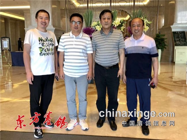 ▲东方赛鸽杂志主编段衷海(左一)科汇总经理时磊(左二)、北京市邮政鸽会于志刚、苏继坤在报到大厅留影