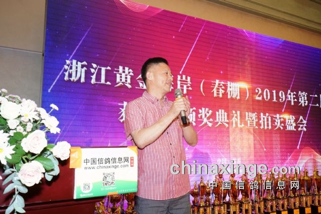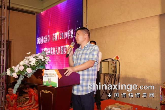 随后浙江省鸽会竞翔部长孔斌讲话,他祝贺黄金海岸取得了本赛季的圆满成功,祝贺每一位取得好成绩的鸽友。孔斌指出,黄金海岸是我省唯一的春棚,另有两个秋棚,这三个棚都是由省鸽会监赛的。我们的监赛是严格按照监管程序执行的,绝对执行三公的,因此我宣布,黄金海岸2019年赛季的所有成绩都是真实有效的。