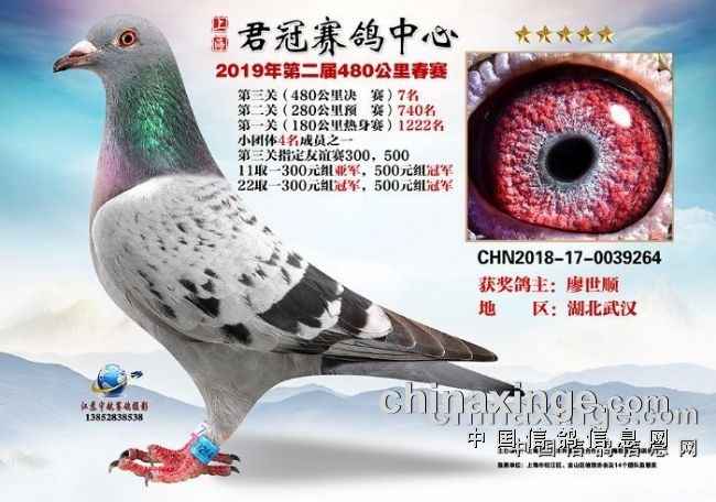 湖北武汉名家廖世顺的17—0437443灰鸽是热身赛的89名、预赛的135名、决赛的46名、三关综合鸽王亚军,此鸽经过多次竞拍,以12万元成交。