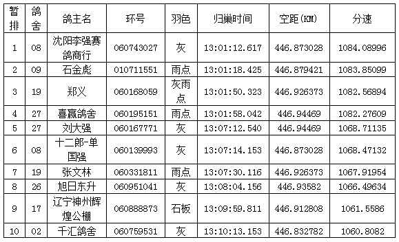 根据直播平台显示,下午13点01分见鸽归巢,沈阳李强赛鸽商行的060743027灰鸽以1084.08996米/分的速度,暂时排在第一名。石金彪的010711551雨点鸽、郑义的060168059灰雨点紧随其后,位列二、三名。以下是前10名报到数据:(最终成绩以俱乐部公布为准。)