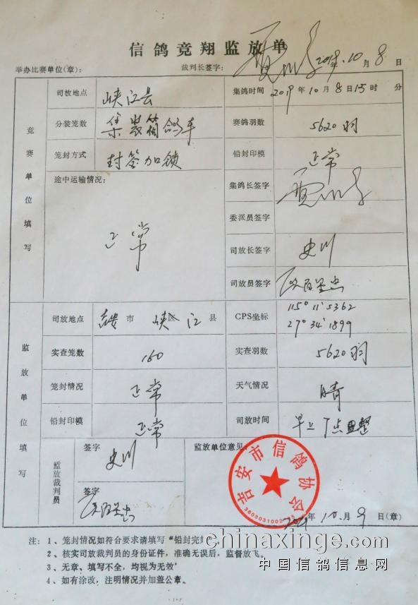 10月9日早上7点整,赛鸽在空距60公里外的江西吉安峡江县巴邱放飞,首羽归巢时间为7点46分13秒。截至发稿时间(15点10分),已归巢5196羽,目前后续梯队的赛鸽仍在归巢中。至此,在公棚团队全体工作人员的配合支持下,裁判组顺利完成本届清棚执裁工作。清棚集鸽、上笼、放飞、归巢过程,全程由中信网签约团队进行视频直播,践行“三公”新格局。
