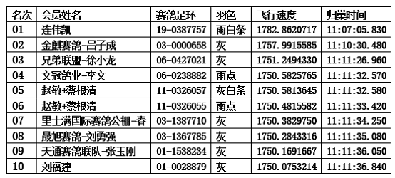 继冠亚军报到之后,开尔勇士大部队浩浩荡荡归来,兄弟联盟-徐小龙先竹名下战将,环号为06-0427021的灰鸽在群雄中奋勇争先喜获季军。文冠鸽业-李文先生的爱将则名列殿军。浙江名家赵敏+蔡根清强强联合合则来了个双响炮、连夺5名、6名的好成绩。