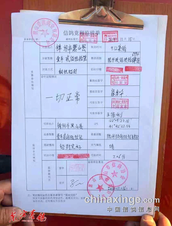 开尔爱心国际秋棚第二关430公里比赛是早上7零6分在辽宁锦州黑山县开笼的,6994羽开尔勇士角逐了本场比赛。放飞时天空晴朗,气温在零下一度左右,寒意袭人,唐山市信鸽协会和锦州市信鸽协会选派的司放裁判心里却是暖暖的,能亲身体验一个品牌公棚赛事的司放是一份荣耀。也许在若干年以后,当鸽友们聚在一起津津乐道地回忆这一场赛事的时候,他们会说,哦,那场比赛是我亲手放飞的。