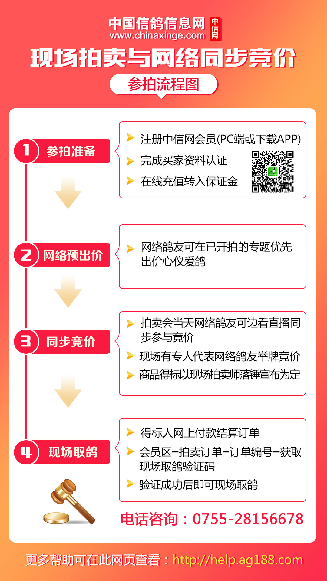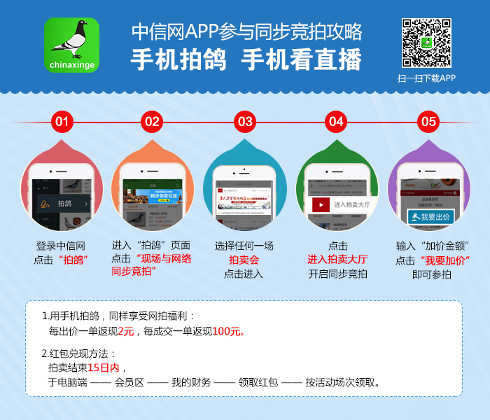 无法前往拍卖会现场的鸽友,使用电脑或手机APP登录中信网,观看现场视频直播,同步拍好鸽,享受足不出户参与竞拍的便利和刺激!网络出价即得2元红包,成交即得100元红包。