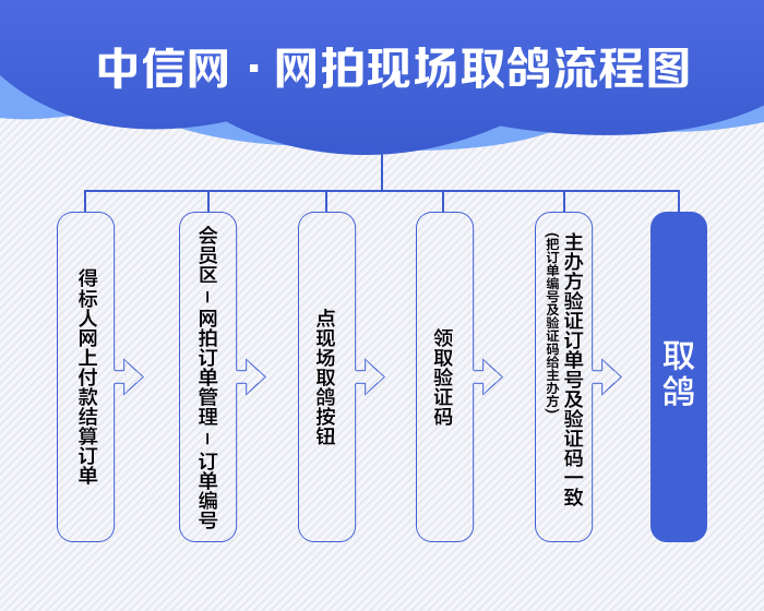 网上得标的鸽友可以委托朋友代为现场取鸽,取鸽步骤:①登录会员区结算订单;②查看订单编号,点现场取鸽按钮,获取订单取鸽验证码,系统会自动发送手机短信到拍卖会员指定手机;③将验证码报给公棚工作人员,验证成功;④签发取鸽凭证,交接拍卖鸽。
