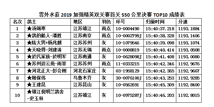 ↑雲外水莊2019加强精英双关赛首关550公里决赛TOP10成绩表
