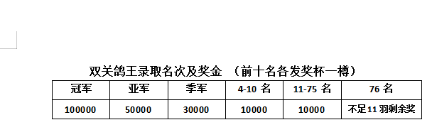 ↑双关鸽王录取名次及奖金 (前十名各发奖杯一樽)