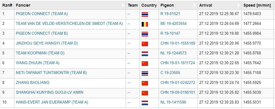 中国鸽友金州鸽业王毅(JINZHOU GEYE-WANGYI 音译)的CHN19-01-1555189于12点30分顺利归来,位列殿军,分速为1455.977米/分。5-10名分别是荷兰考夫曼、中国王志军、泰国NETI-TAPANAT TUNTIMONTRI、中国张宝亮、中国上海堃瀛国际、荷兰爱亚卡普。