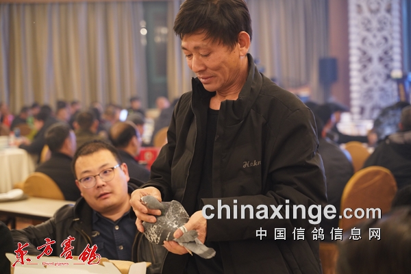 在拍卖会现场。我们采访了小团体冠军获得者、扬州当地鸽友赵俊先生。他在决赛中取得了45、47、125、222名的好成绩,另一羽获得504,是222名的同窝。他把45、47和125名拍回了家,222名则让给了鸽友。他说,家里的种鸽够用,该放手还是要放的。他一直在平安数字参赛,曾取得过不少好成绩,今年的收获最大。他说,平安数字是好公棚,他会一直送的。