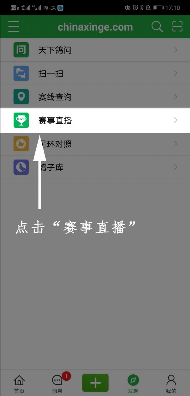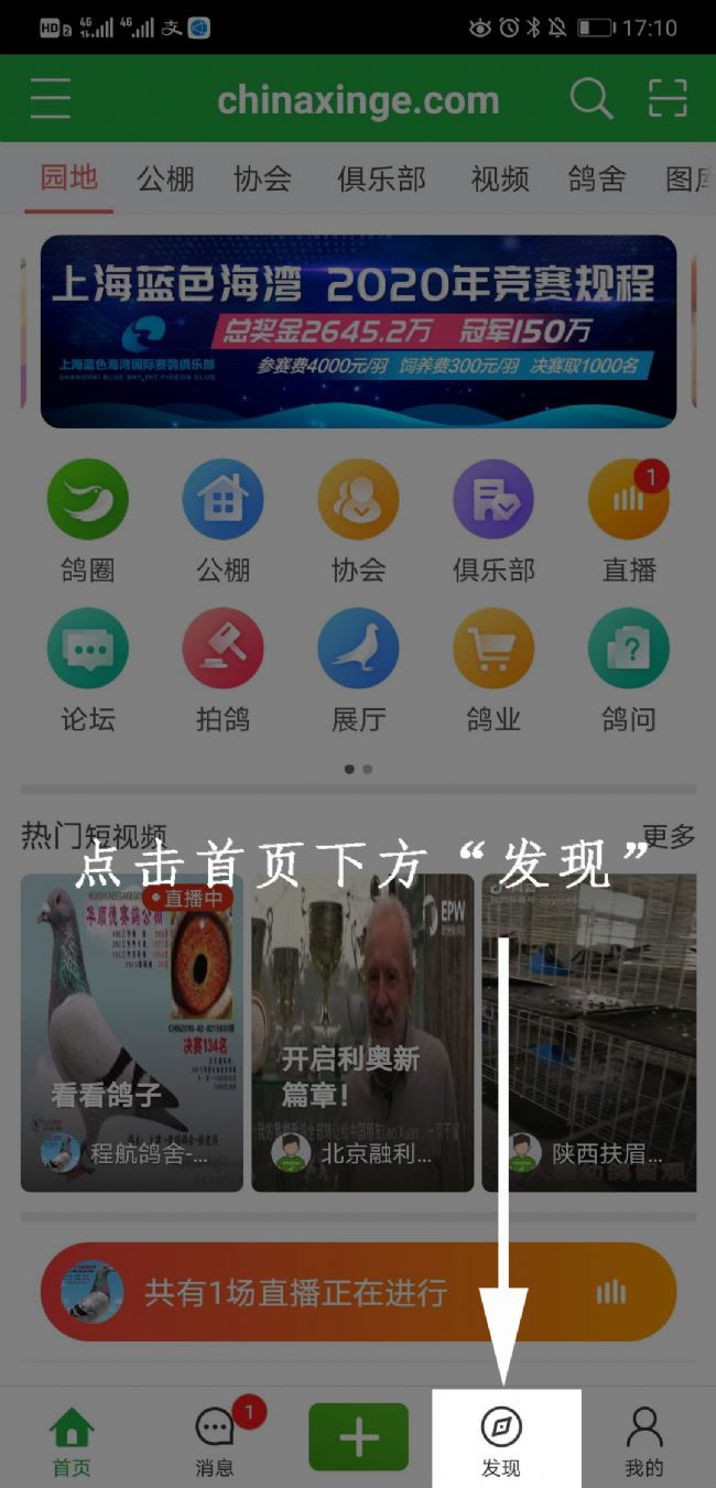 一、APP入口:中国信鸽信息网APP首页→发现→赛事直播
