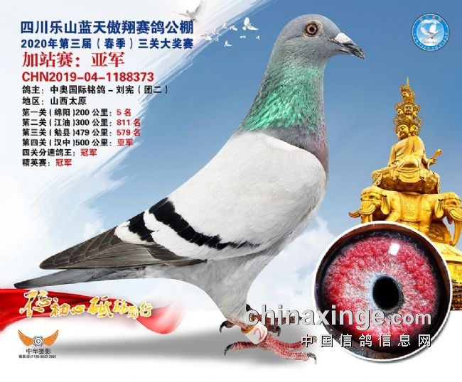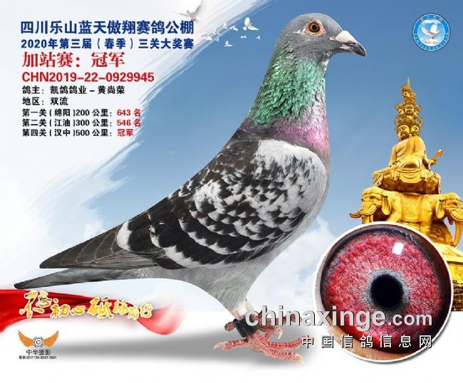 2020年四川乐山蓝天傲翔赛鸽公棚第三届(春季)大奖赛,收鸽破万,经过三关激战,成功挑战500公里加站赛,1879羽再战沙场。鸽主凯鸽鸽业-黄尚荣的2019-22-0929945雨点鸽,以1019.2582米/分的分速拿下头魁;中奥国际铭鸽-刘宪(团二)的2019-04-1188373灰鸽不仅斩获亚军,更以四关累积分速第一获得四关鸽王冠军!