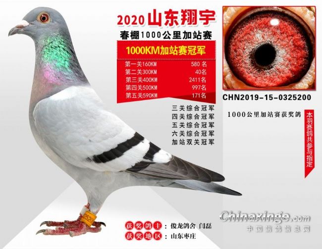 首开春赛一鸣惊人,说的就是山东翔宇春棚,山东翔宇春棚在进行三关正赛、590公里加站赛后,还要打1000公里加站赛,可谓霸气侧漏!这场千公里加站赛共计集鸽928羽,交费参赛415羽。开笼第二天中午,在第一羽赛鸽归巢一小时后,俊龙鸽舍-闫磊的一羽2019-15-0325200灰鸽,以分速732.6036米/分获得加战赛冠军,并拿下加站双关冠军、三关综合冠军、四关综合冠军、五关综合冠军、六关综合鸽王冠军,狂揽大奖,拿下鸽王大满贯。