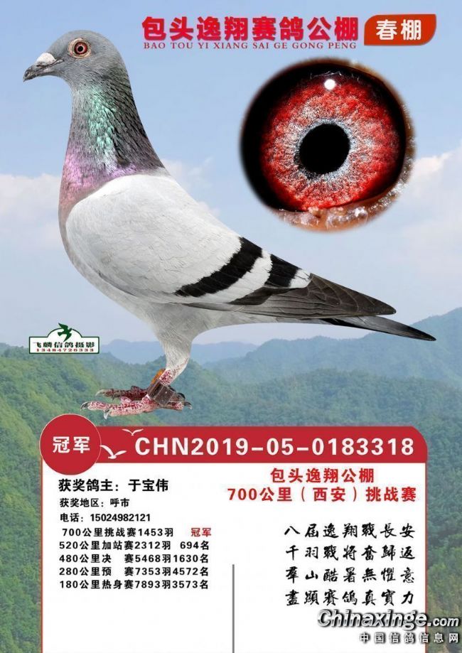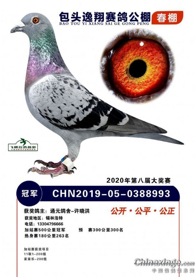 2020年内蒙古包头市逸翔赛鸽俱乐部第八届春赛,决赛冠军鸽主前五揽二。530公里加战赛归巢超五成,不足一小时前百名报满,通元鸽舍-许晓洪的一羽2019050388993荣获加站赛冠军,分速1280.6706米/分。700公里挑战赛,1453羽精英应战,鸽主于宝伟的一羽环号为2019050183318灰鸽于开笼第二天一早报进,获得冠军。