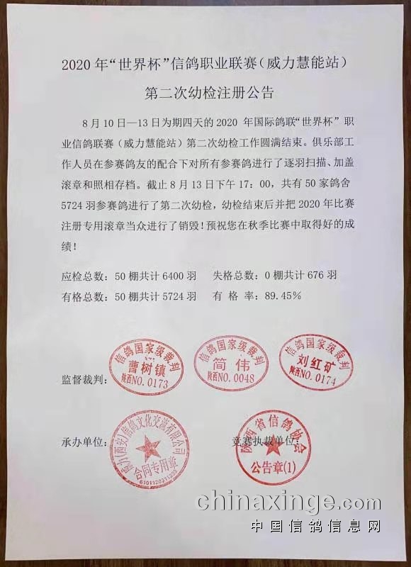 2020年“世界杯”信鸽职业联赛(威力慧能站)竞赛参赛鸽检录工作落下帷幕,8月10日至13日,在西安威力俱乐部全体员工努力下、参赛鸽友配合下、陕西省信鸽协会三位国家级裁判查验下,总计有50家鸽舍、5724羽通过检录,详见《第二次幼鸽检录注册公告》。