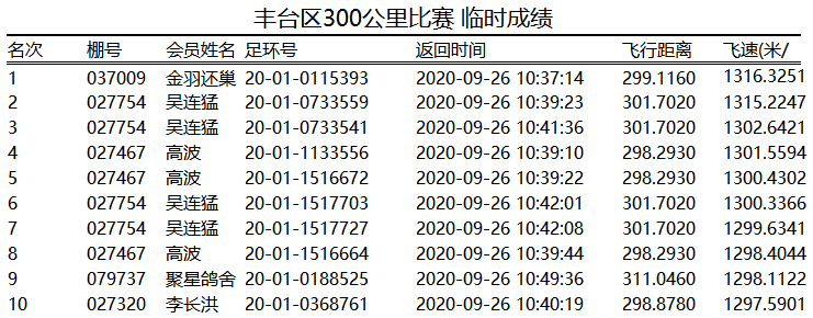 据直播平台数据显示,开笼三个多小时后见鸽,鸽主金羽还巢的一羽环号为2020010115393赛鸽,以1316.3251米/分的分速领先;鸽友吴连猛先后归巢四羽,分别排名第二、第三、第六、第七位,最高分速1315.22470米/分。