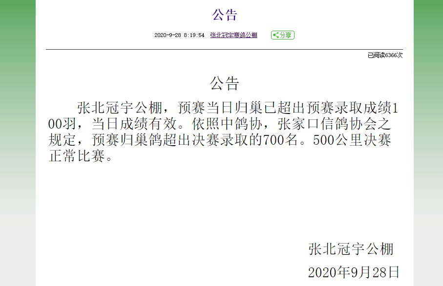 9月26日星期六,河北张家口一公棚打300公里预赛,7121羽参赛鸽于早上7点39分在内蒙古锡林浩特南放飞。根据放飞开笼视频显示,司放地晴天,有太阳。