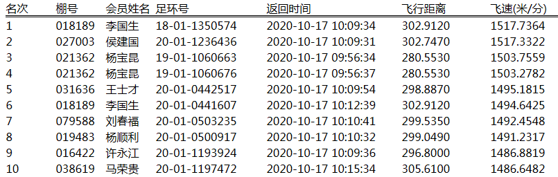 上午不到10点,杨宝昆的两羽赛鸽环号分别为2019011060663、2019011060663,以1503.75590米/分和1503.27820米/分的分速报进,占据第三、第四;鸽主李国生的一羽2018011350574赛鸽紧随其后,以1517.7364米/分的分速强势登顶,斩下冠军;排行第二的侯建国的2020011236436爱鸽,分速1517.3322米/分,半个小时之内报进近千羽。
