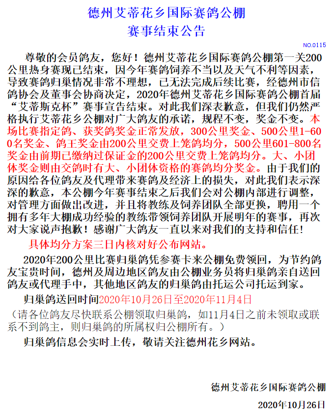 10月26日,德州艾蒂花乡国际赛鸽公棚发布公告表示,因为赛鸽饲养不当以及天气因素,无法继续完成后面的比赛,比赛宣告结束,对此深表歉意。但仍然坚守对广大鸽友的承诺,严格执行规程:规程不变,奖金不变!200公里比赛指定鸽、获奖鸽奖金正常发放,300公里奖金、500公里1-600名奖金、鸽王奖金由200公里交费上笼鸽均分,500公里601-800名奖金由前期已缴纳过保证金的200公里交费上笼鸽均分。大、小团体奖金则由交鸽时有大、小团体资格的赛鸽均分奖金。