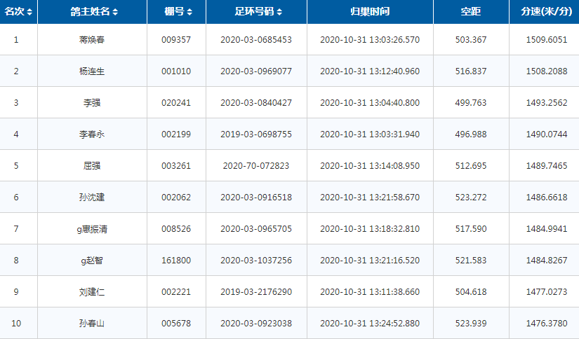 开笼不到6个小时,鸽主蒋焕春的一羽环号为2020-03-0685453赛鸽高速归巢,分速达1509.6051米/分;第二名是杨连生的一羽2020-03-0969077赛鸽,分速1508.2088米/分;李强的一羽环号2020-03-0840427赛鸽,则以1493.2562米/分的分速排名第三;前99名分速均在1400米/分之上!