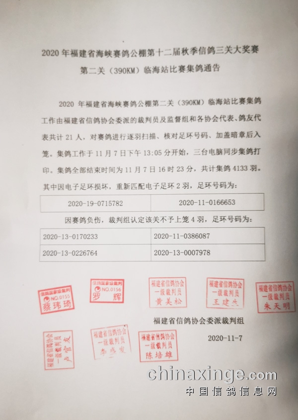 裁判盖章的集鸽通告
