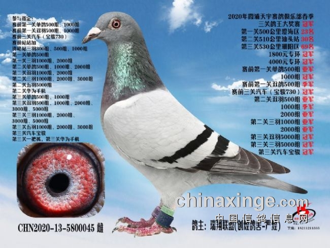 2020年霞浦天宇职业赛鸽俱乐部春季南线三关鸽王大奖赛中,来自7号棚瑞翔联盟,鸽主创煌鸽舍-严煌的一羽环号13-5800045灰色砂眼雌鸽,三关均获得高位,以第一关23名、第二关30名、决赛69名的优异成绩,获得双关综合4名、三关综合冠军,获得多项指定冠军,赢得奖金超百万。妥妥的实力派鸽王![详细]